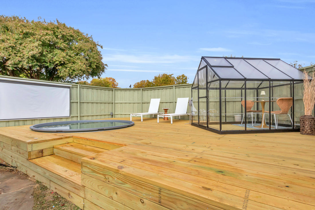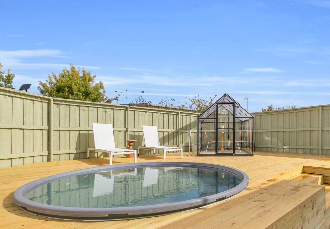A private outdoor retreat featuring a heated & chilled pool, outdoor cinema and greenhouse lounge, complemented by an intimate courtyard with a fire pit and barbecue.